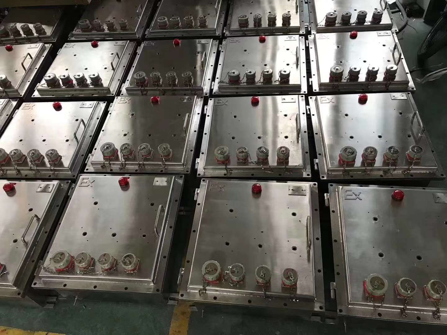 6.防爆配电箱的外涂层颜色应根据甲方的要求进行静电喷塑,涂层应附着牢固,颜色均匀,无皱纹、剥落、斑点、漏喷等不良现象,在距离1米处观察无明显色差和反光,表面平整、干净,无凹坑、划痕等